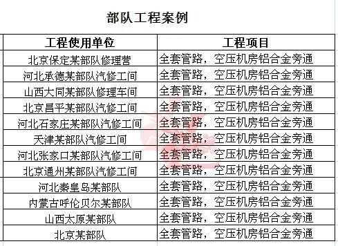 部隊(duì)工程案例總表,全套管路