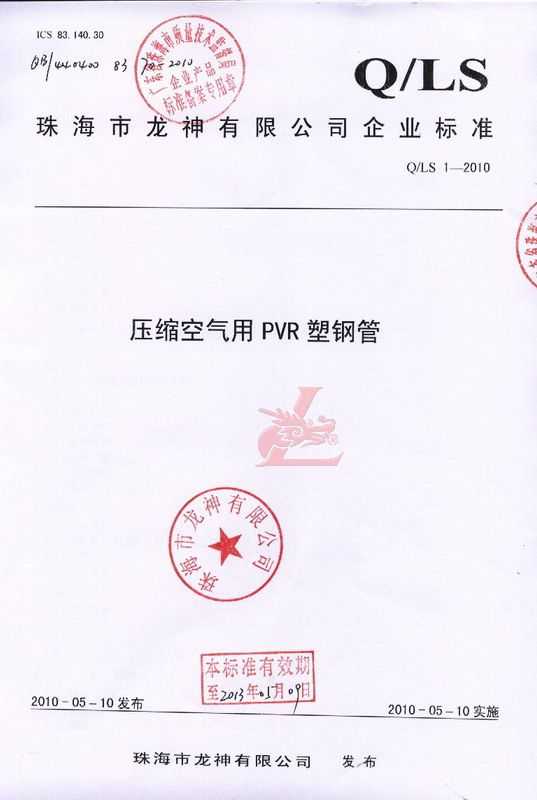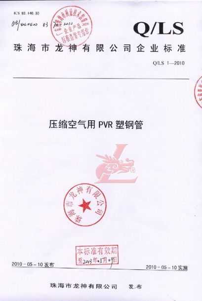 龍神壓縮空氣PVR塑鋼管成功申請(qǐng)企業(yè)執(zhí)行標(biāo)準(zhǔn) 2010年5月珠海市龍神有限公司“壓縮空氣PVR塑鋼管”得到珠海市質(zhì)量技術(shù)監(jiān)督局認(rèn)可,特此頒發(fā)“壓縮空氣PVR塑鋼管企業(yè)執(zhí)行標(biāo)準(zhǔn)”,龍神公司在嚴(yán)格執(zhí)行標(biāo)準(zhǔn)下,保證產(chǎn)品質(zhì)量。 2010-05-20 9851
