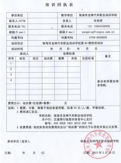 3、培訓(xùn)證明及證書:①參訓(xùn)教師在培訓(xùn)結(jié)束時可獲得由珠海市龍神汽車職業(yè)培訓(xùn)學(xué)校頒發(fā)培訓(xùn)證明。