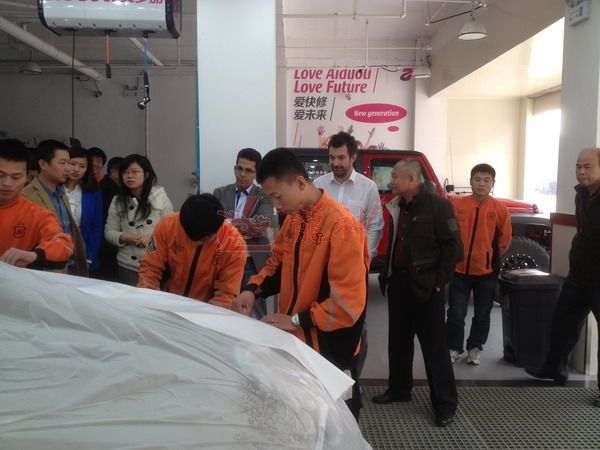2013年特邀國外專家赴北京車爵士演示車縫泡膠條的使用 本司訊:2013年4月北京晴空萬里,龍神公司特邀英國專家一行五人,來到了北京車爵士進行汽車噴涂遮蔽技術(shù)交流。首先公司一行了解車爵士的汽車噴涂情況及詢問了使用的遮蔽工具情況。隨后英國專家針對在汽車噴漆時難噴涂的車門縫隙、玻璃死角等地方的專業(yè)遮蔽工具的演示。車縫泡沫膠:用于車身所有縫隙的遮蔽,有效隔離及遮蔽漆霧噴入車縫里。 2013-04-08 12061